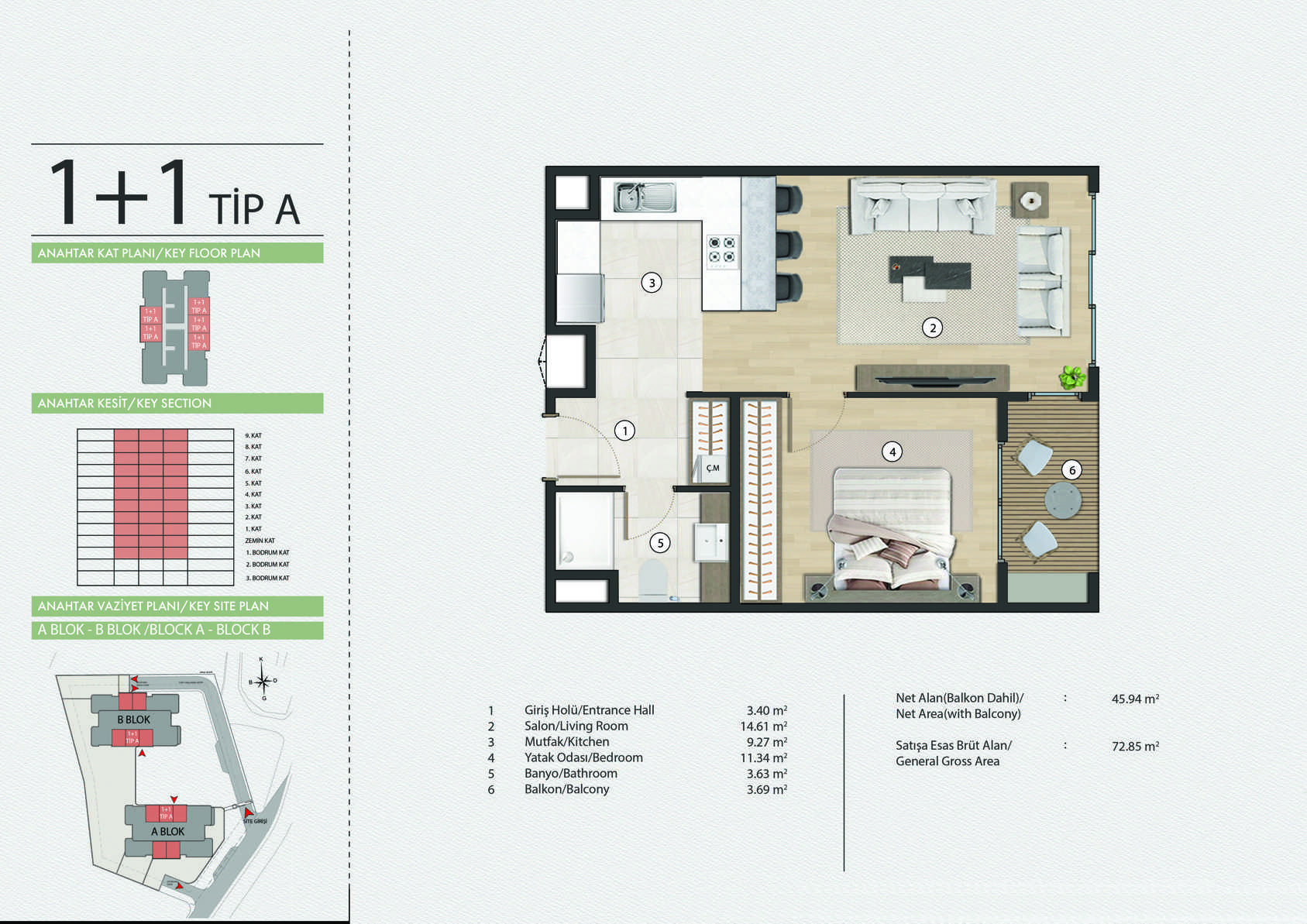 Covering an area of 7,675.24 m², the project features two stylish 13-story blocks comprising 251 residences and 4 commercial units. The complex offers a variety of layouts — from cozy 1+1 to spacious 4+1, including apartments, duplexes, and ground-floor units with private gardens. This diversity of formats allows everyone to choose a home that suits their preferences and lifestyle.
